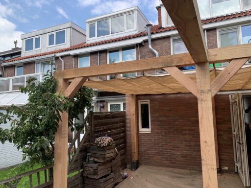 Naast de overkapping met schuur hebben wij ook een pergola geplaatst en deze voorzien van een schaduw doek ! De robuuste douglash staanders rusten op betonnen poeren.