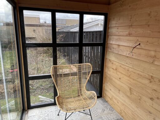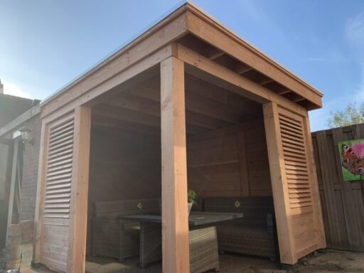 De beide overkappingen hebben een afmeting 6 meter lang en 3 meter breed zijn gemaakt van douglas hout en de ene voorzien van glazen deuren en de andere kant voorzien van glazen ruitjes .