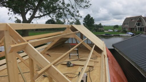 Plaatsen van houten dak constructie