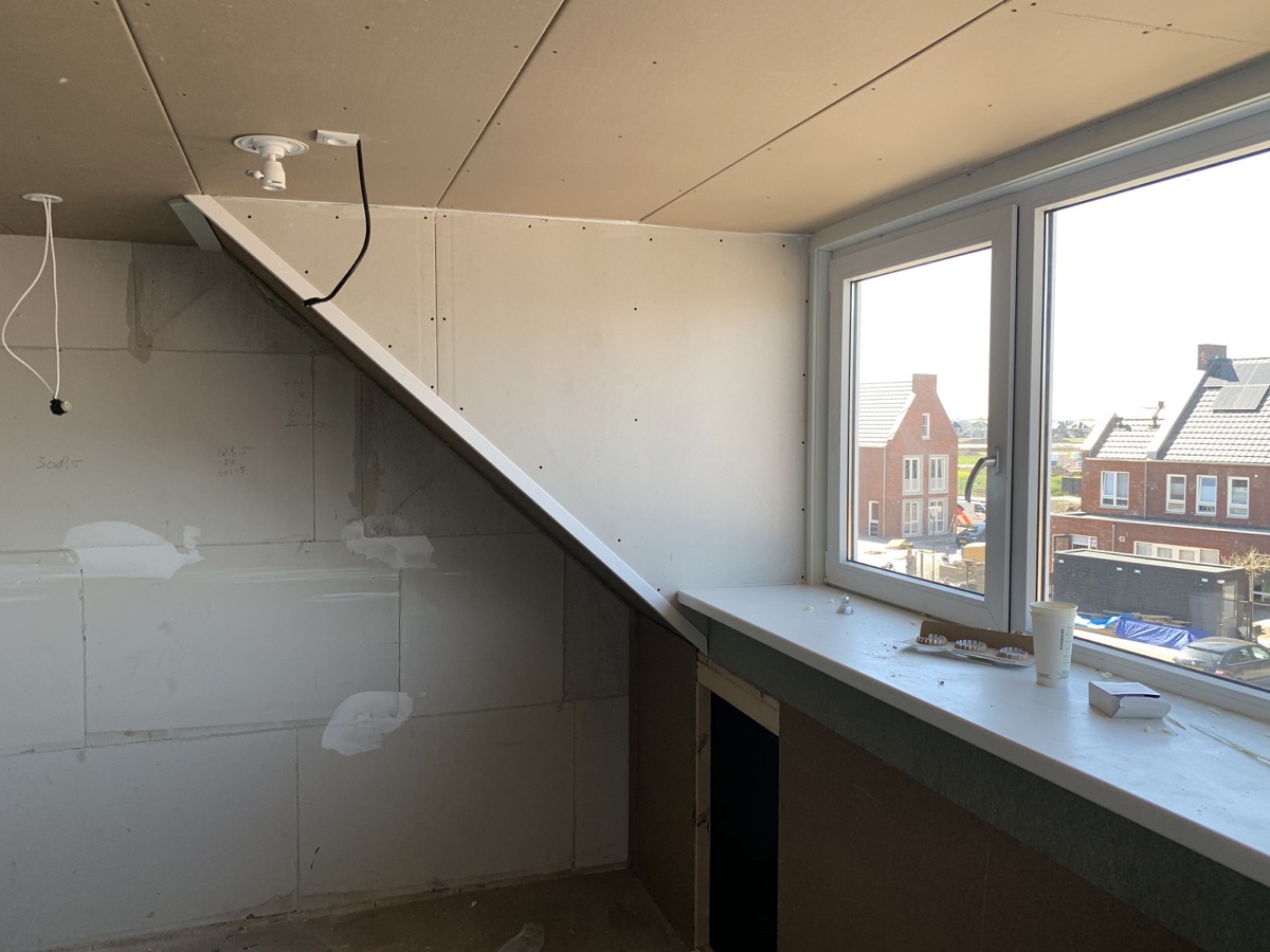 Afgelopen week hebben wij een dakkapel afgetimmerd en een vide geplaatst in Reeuwijk. Nadat een ander bedrijf het dakkapel had geplaatst hebben wij de aftimmering voor ons rekening genomen . door het plafon door te trekken en deze te gipsen en voor zien van spotjes !