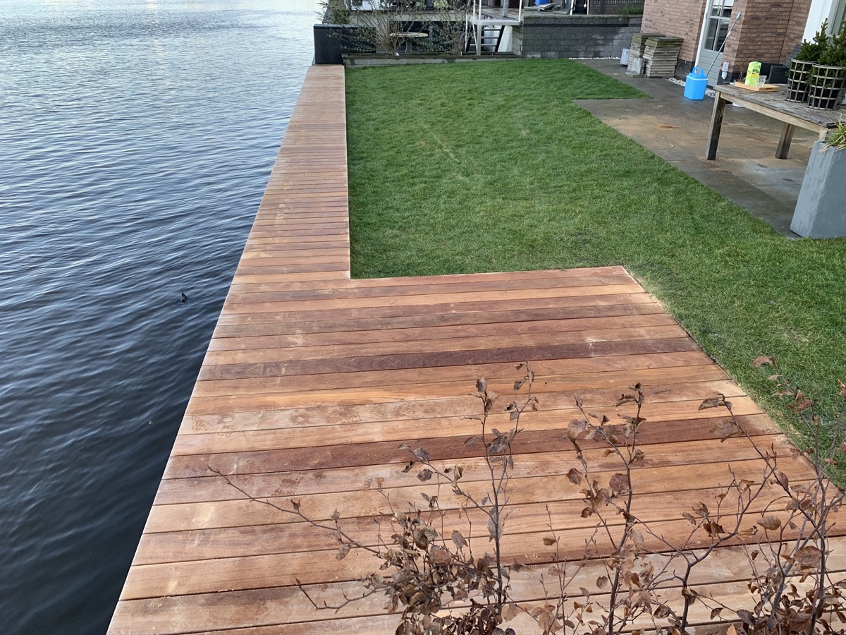 Afgelopen week een hardhouten vlonder van cumaru delen geplaatst in Alphen aan de Rijn .De vlonder rust groten deels op de betonnen kade en is vast geschroefd op hardhouten liggers met Spax R.V.S Vlonderschroeven.