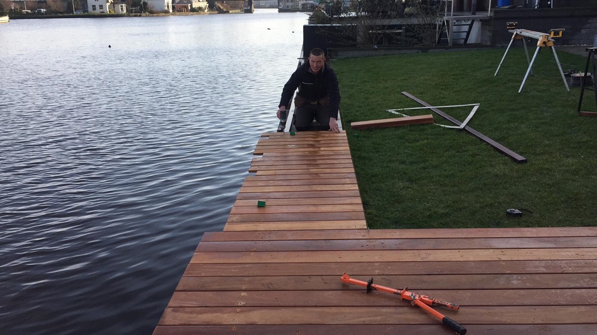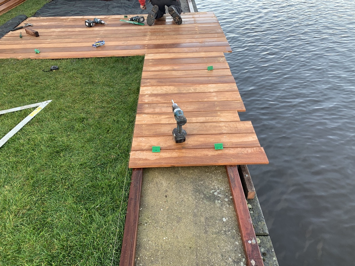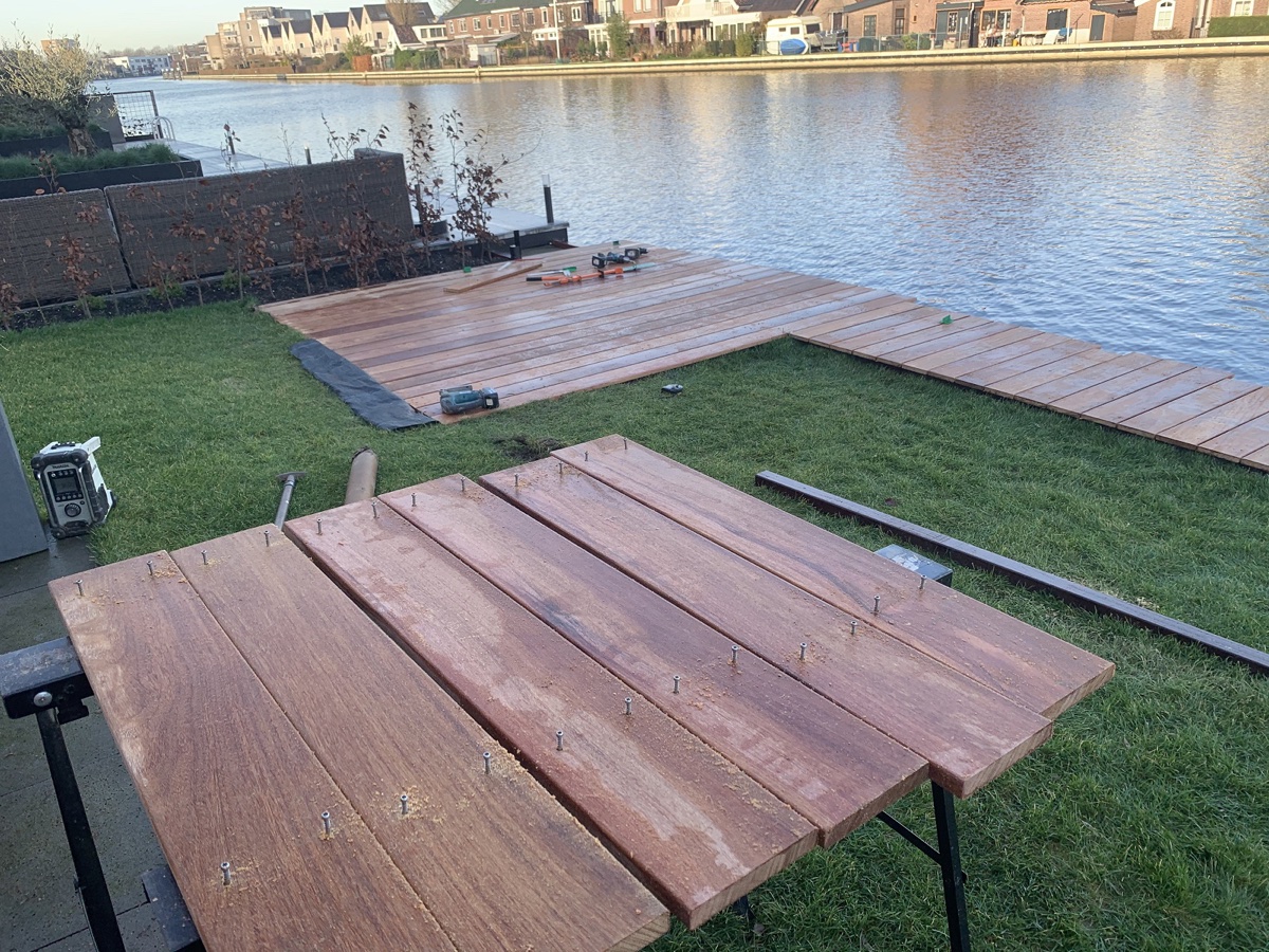 Afgelopen week een hardhouten vlonder van cumaru delen geplaatst in Alphen aan de Rijn .De vlonder rust groten deels op de betonnen kade en is vast geschroefd op hardhouten liggers met Spax R.V.S Vlonderschroeven.