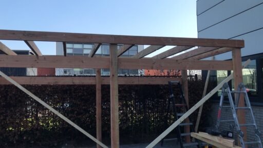 Douglas houten Overkapping geplaatst Boretti AmsterdamDe overkapping is gemaakt van douglas houten palen 120 x 120 mm deze rusten op hardhouten palen ,die voor de fundering zorgen van de overkapping .