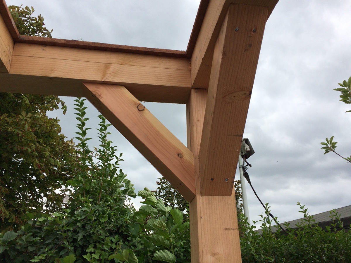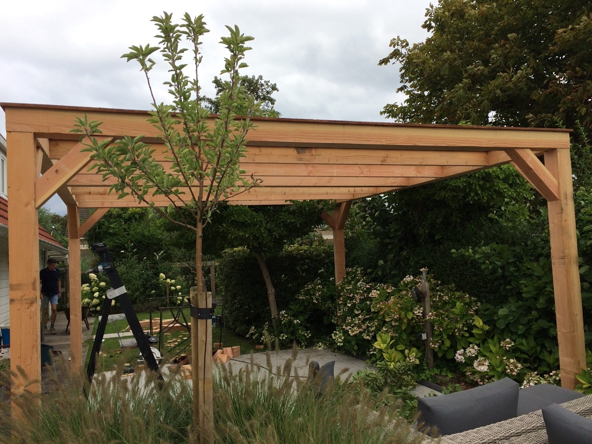 De pergola is gemaakt van robuuste douglas houten palen en balken.