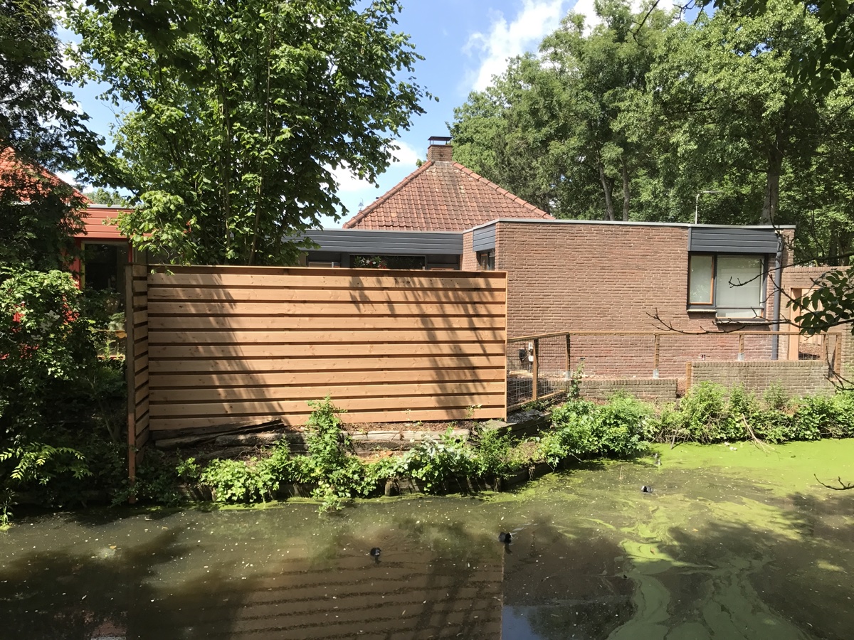 Plaatsen van douglash houten geschaafde planken om en om