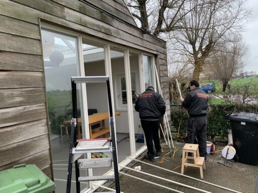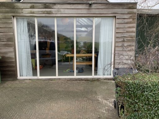 Afgelopen week een kozijn waar dubbelen deuren in zaten ,deze verwijdert, om er vervolgens twee tussen stijlen erin te plaatsen ,waarin het nieuwe dubbelglas hr++ door glasservice randstad vakkundig geplaatst kon worden.