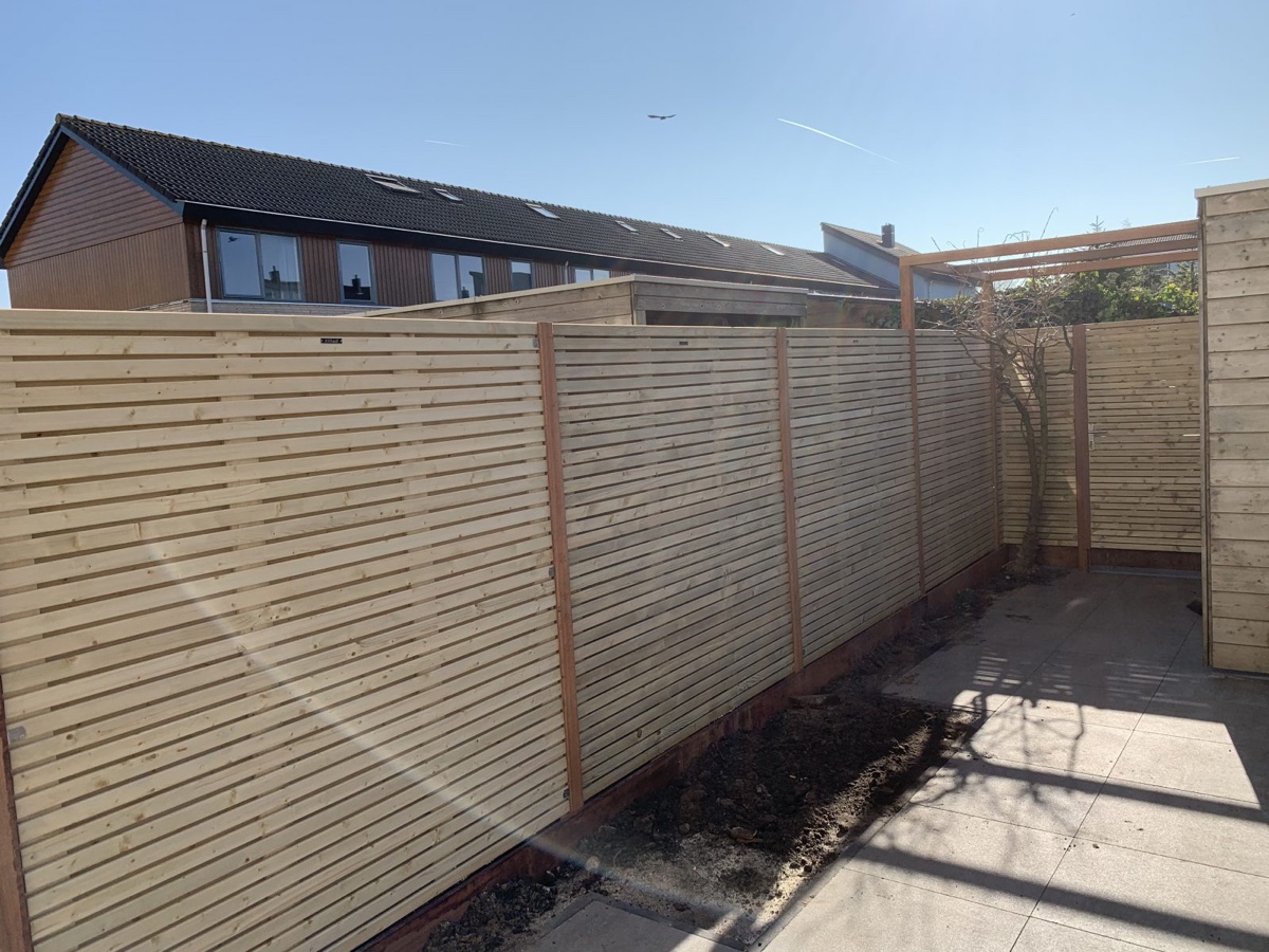 Afgelopen week een Elan schutting geplaatst in Alphen aan de Rijn deze schermen zijn gemaakt van smalle horizontale geïmpregneerde latjes van het merk Hillhout en hangen tussen hardhouten palen.daarnaast is de schutting voorzien van een hardhouten borderplank.