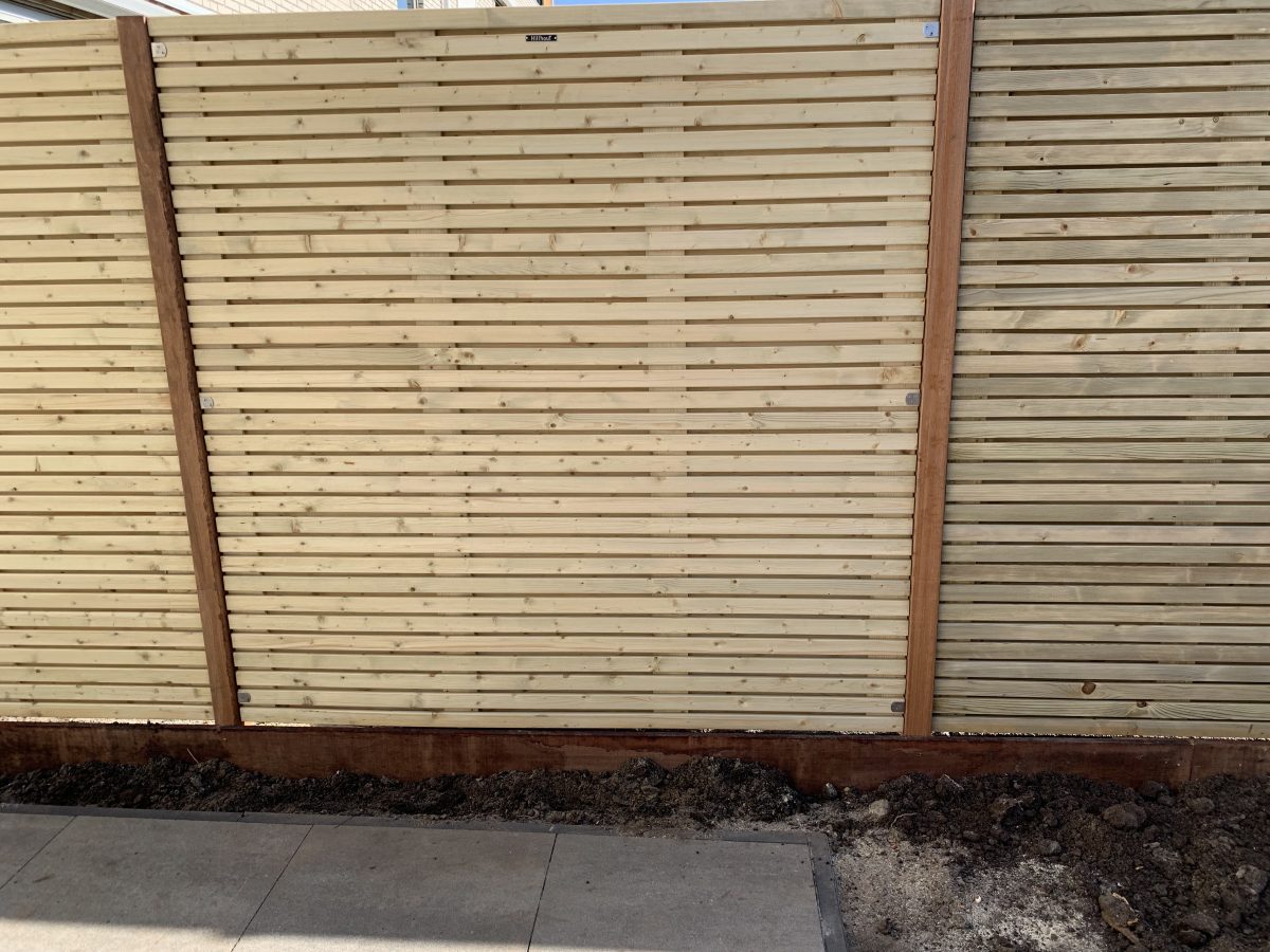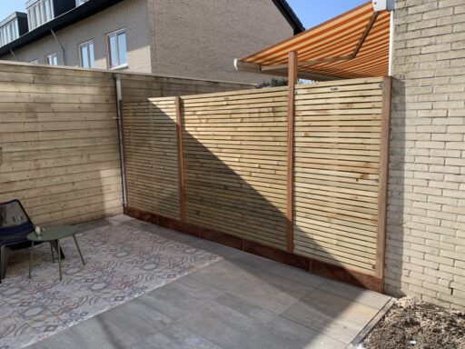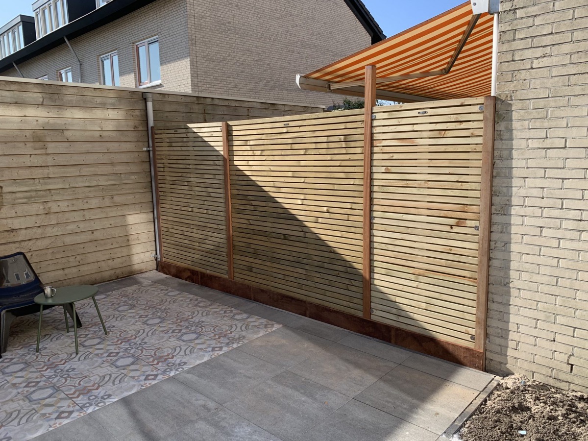 Afgelopen week een Elan schutting geplaatst in Alphen aan de Rijn deze schermen zijn gemaakt van smalle horizontale geïmpregneerde latjes van het merk Hillhout en hangen tussen hardhouten palen.daarnaast is de schutting voorzien van een hardhouten borderplank.