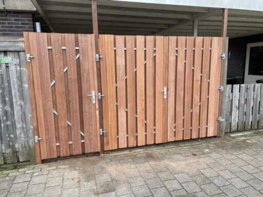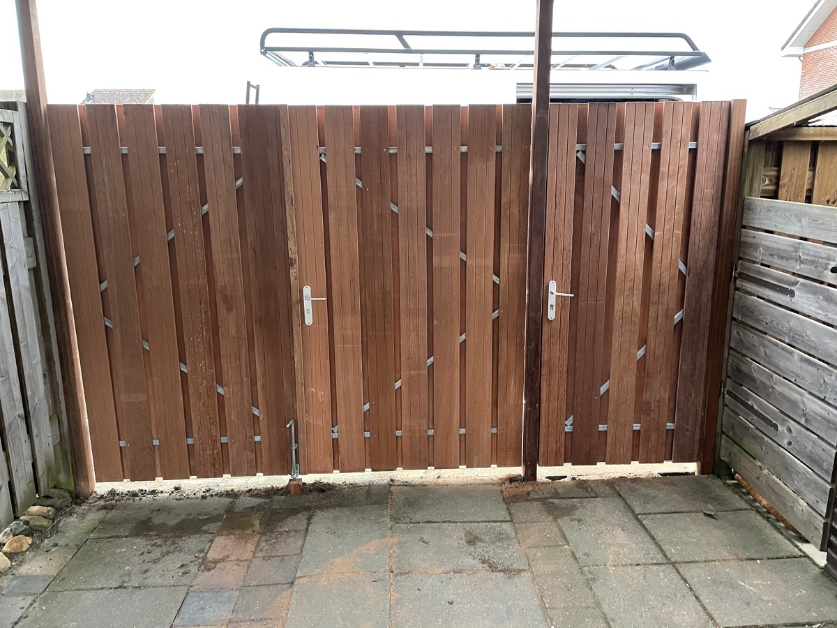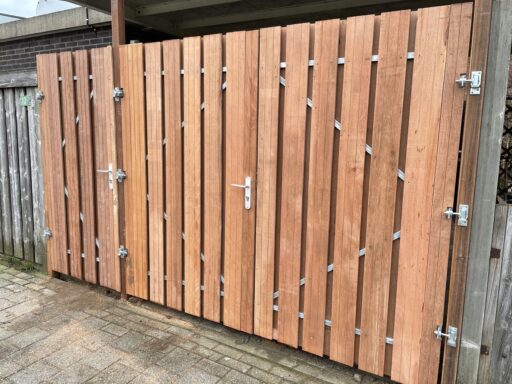 afgelopen week hard houten carportdeuren geplaatst Schoonhoven .De deuren bestaan uit een gegalvaniseerd stalen frame met daarop hardhouten schutting planken gemonteerd.