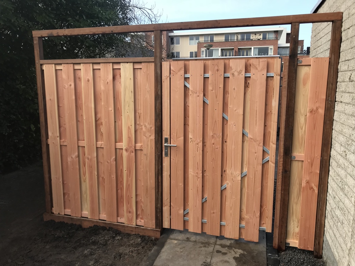 Douglas houten overkapping Een douglash houten overkapping met schutting en bijpassende poortdeur geplaatst in Nieuwebrug. Ook een overkapping of schutting laten…