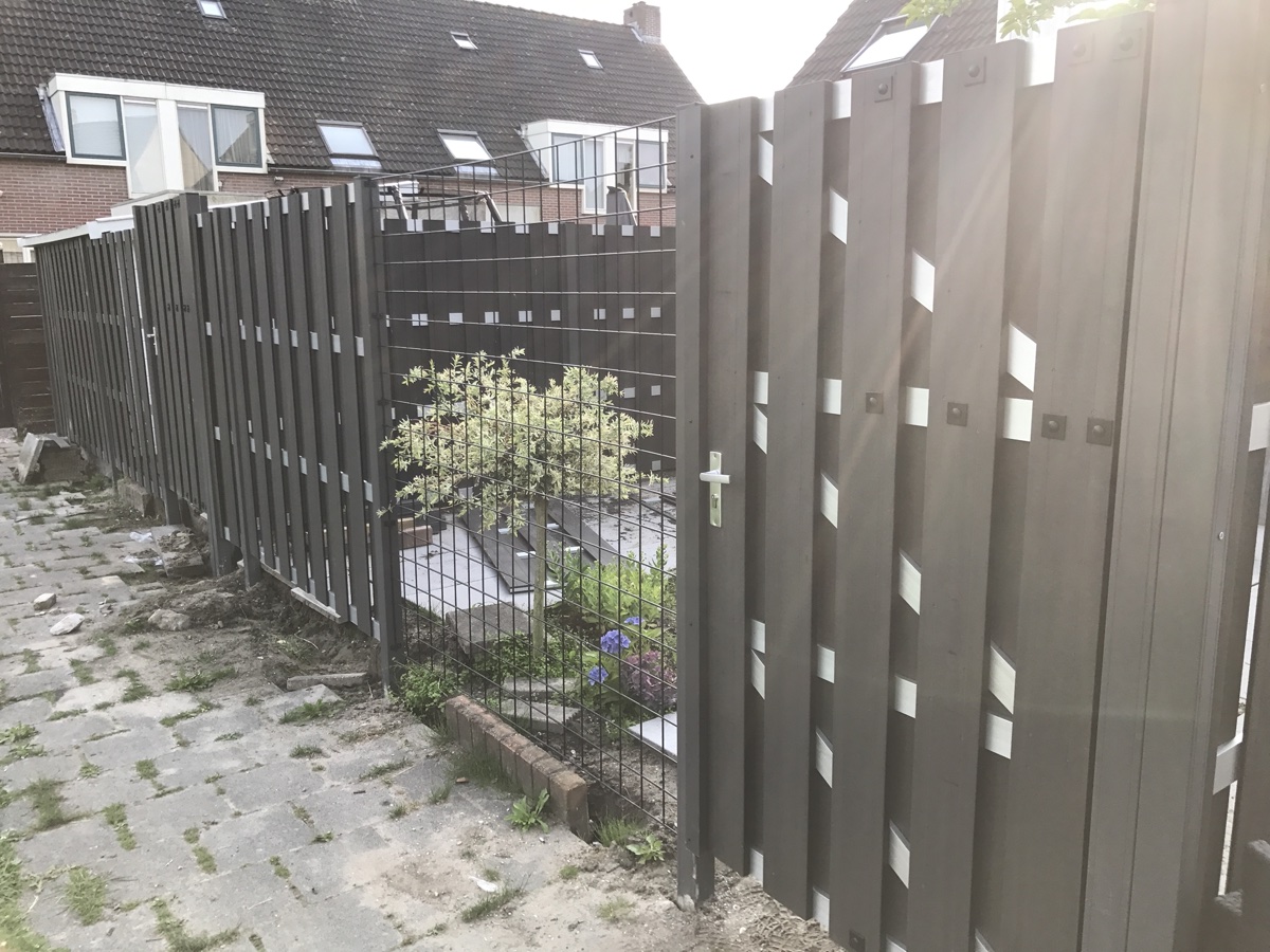 kunststof schutting delen geplaatst en twee bij passende kunststof poortdeuren afgehangen en sluit baar gemaakt in Poortugaal .