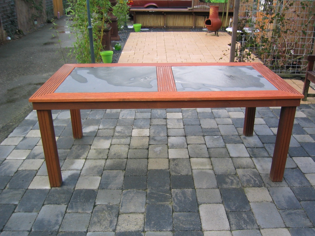 Daarnaast zijn er 2 natuur stenen tegels in verwerkt dit maak de hardhouten tuin tafel helemaal af.