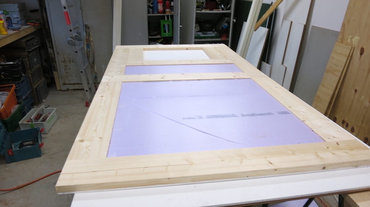 Deze platen zijn bevestigd op een vuren houten frame opgevuld met roof mate voor een hogere isolatie waarde.