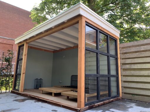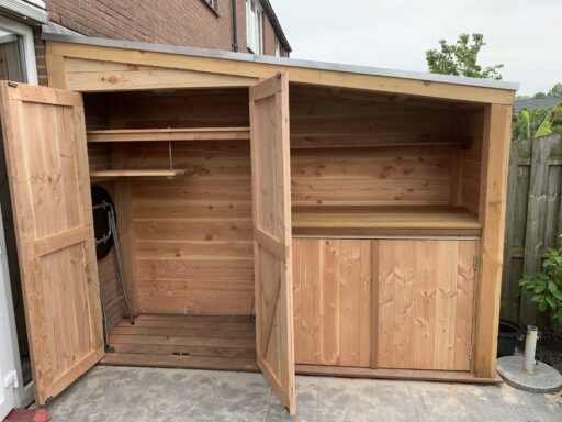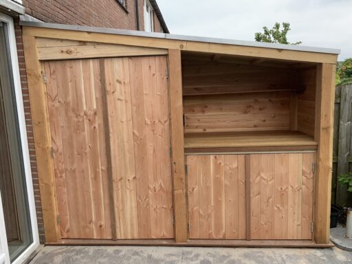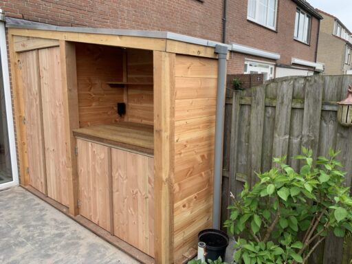 Afgelopen week een op maat gemaakte douglas houten tuinkast geplaatst in Ter Aar . De fundering is van hardhout met daarop bankiray vlonder delen, de rest van de kast is gemaakt van geprofileerde douglas planken en op het dak ligt EPDM dakbedekking.
