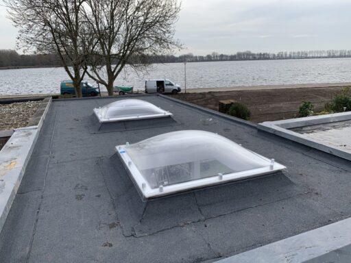 Het dak is geplakt met bitumen en voorzien van 2 koepels.
