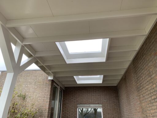 Verder bestaat de overkapping uit voor gelakte vurenhouten balken en underlayment als dak beschot.