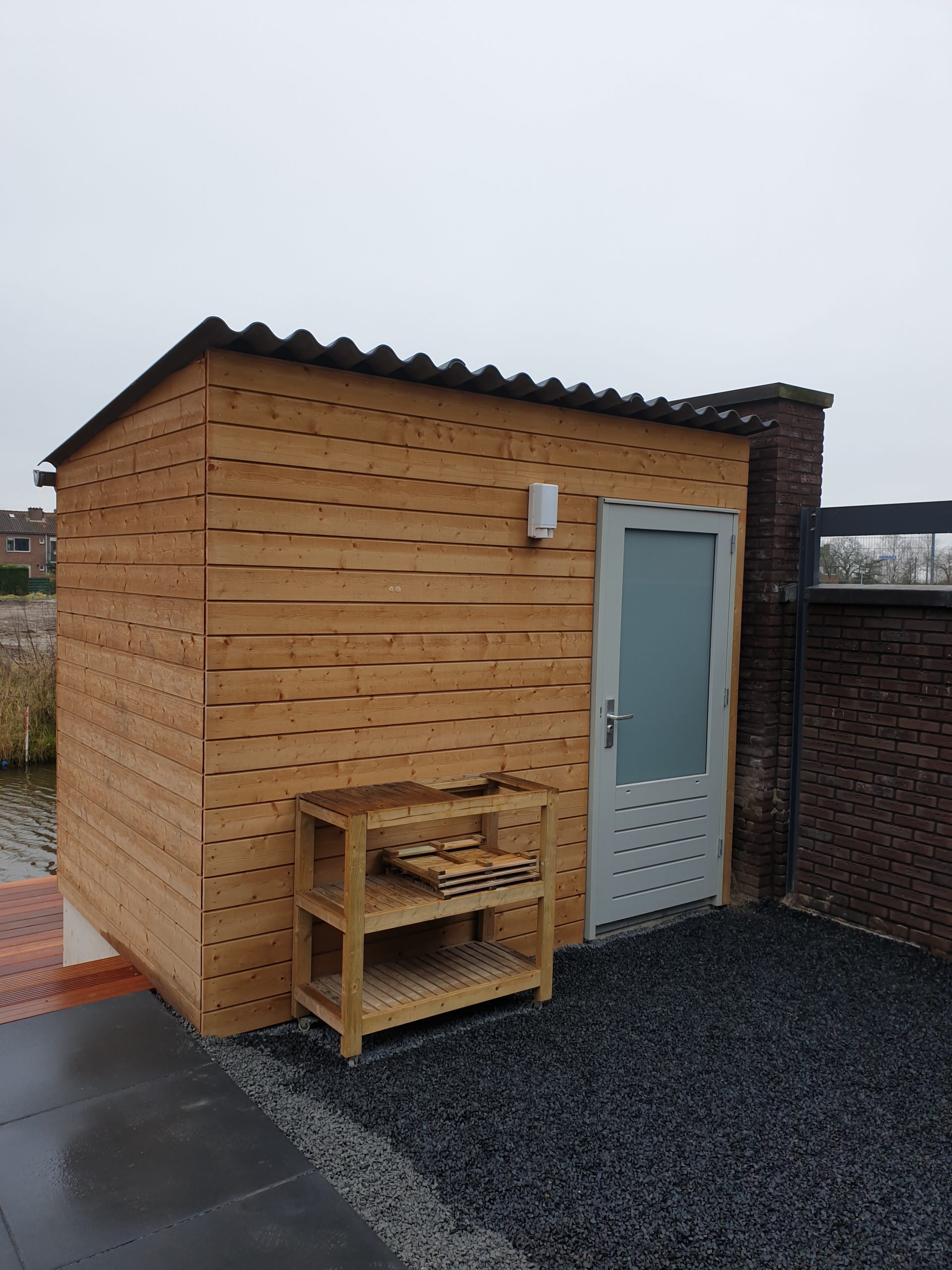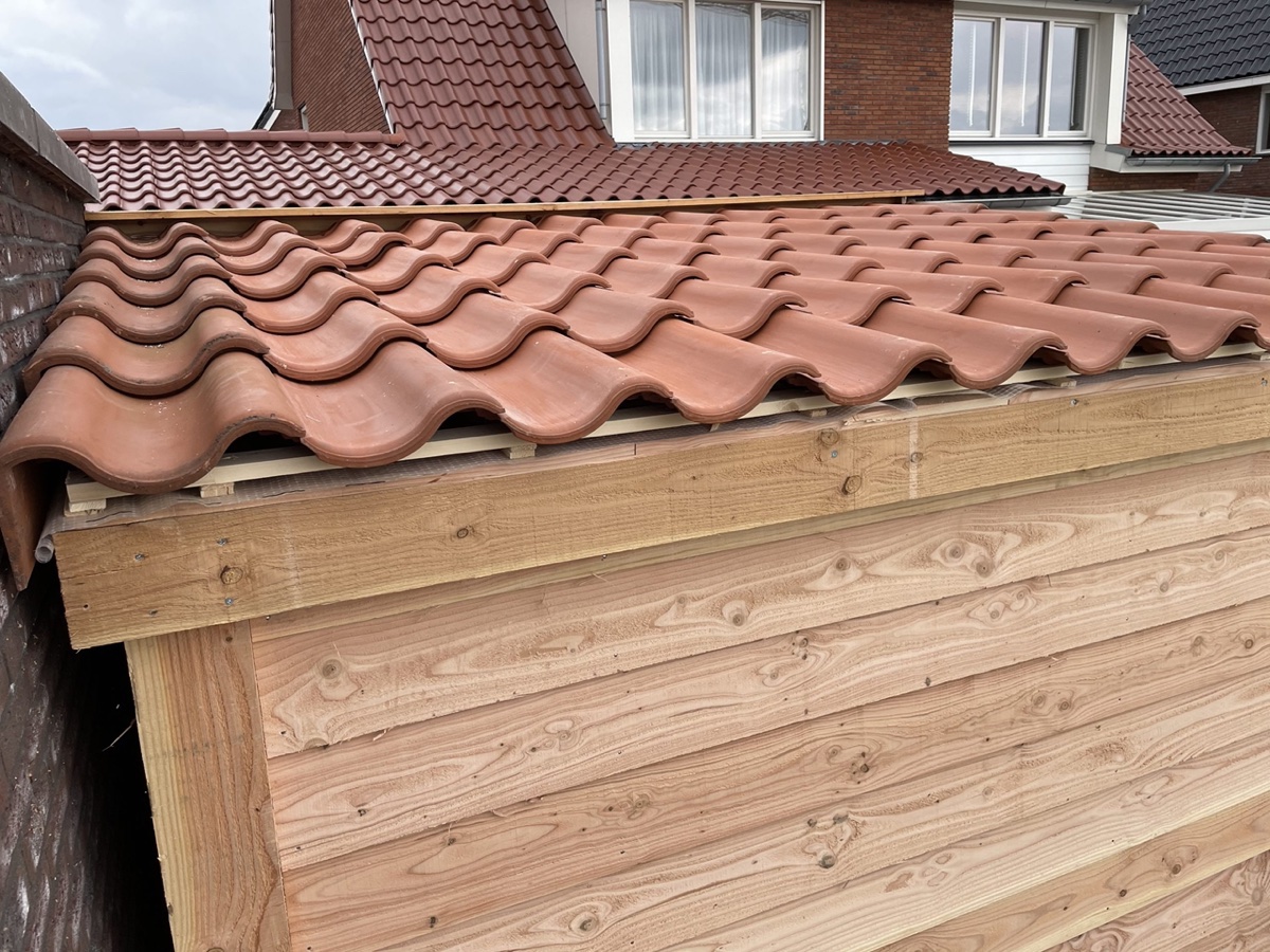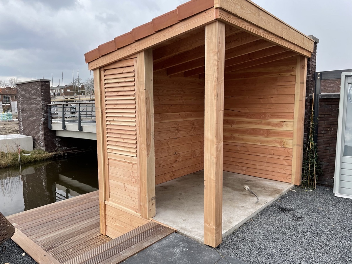 Afgelopen week een standaard Nieuwbouw schuurtje omgebouwd tot overkapping van douglas hout met in de zijwand een shutter paneel en op het dak liggen pannen.