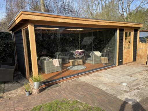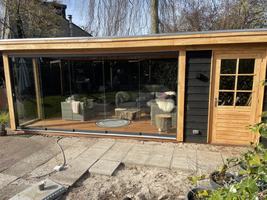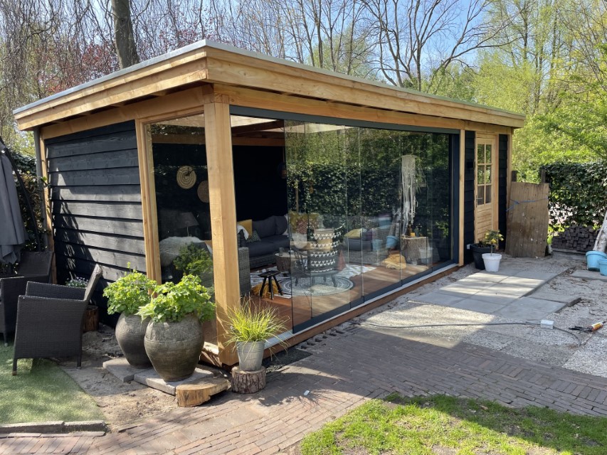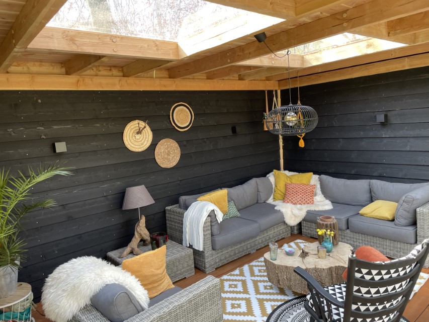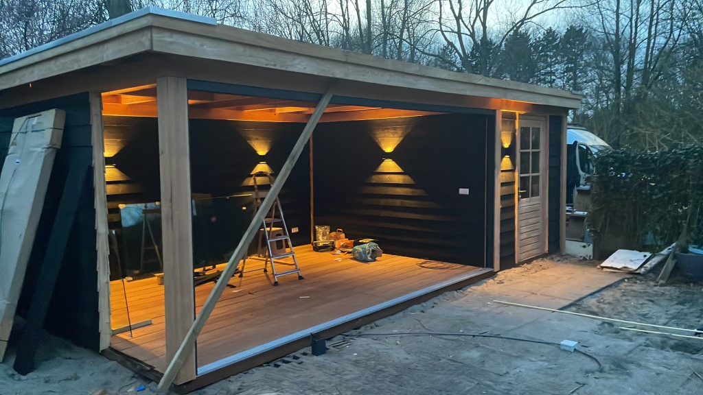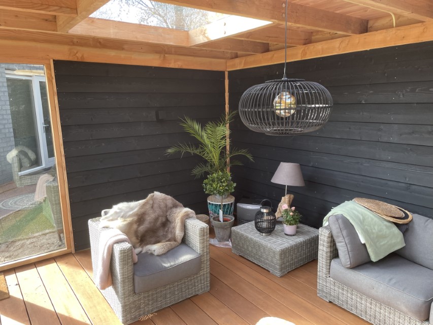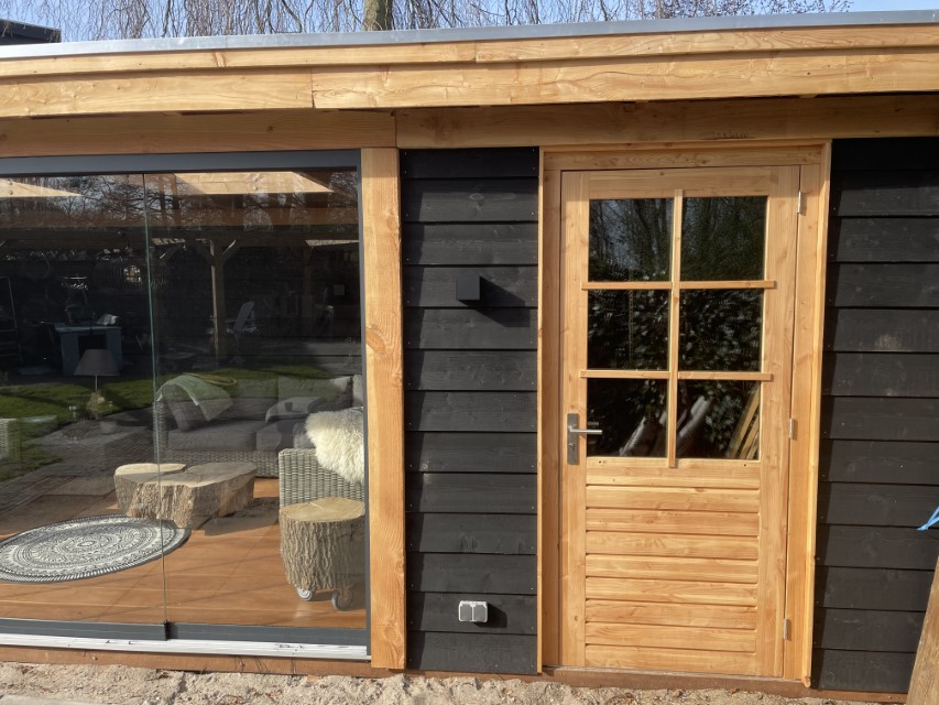 De overkapping bestaat uit douglas palen die zorgen voor een robuuste uitstraling , de wanden zijn bekleed met zwart gespoten Zweedse rabat delen. in de berging hebben we een mooie deur van douglas hout met glas van woodvison geplaatst. aan de voorkant van de overkapping hebben we een glazen schuifpui geplaats en een vast raam aan de zijkant voor nog meer licht inval.