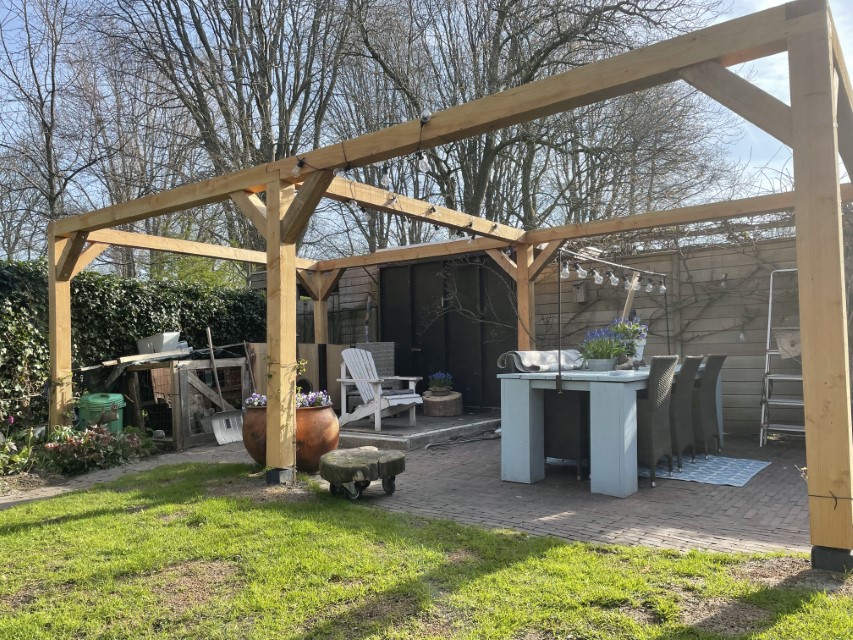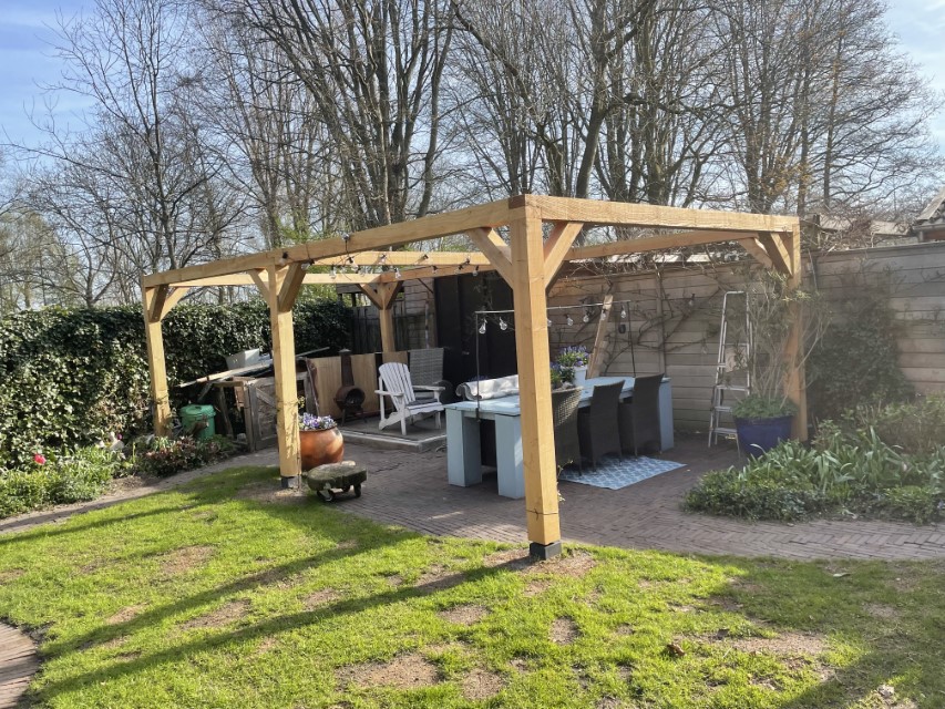 Ook hebben wij in dezelfde tuin een pergola geplaats en is gemaakt van dezelfde douglas palen , de staanders staan op betonnen poeren.