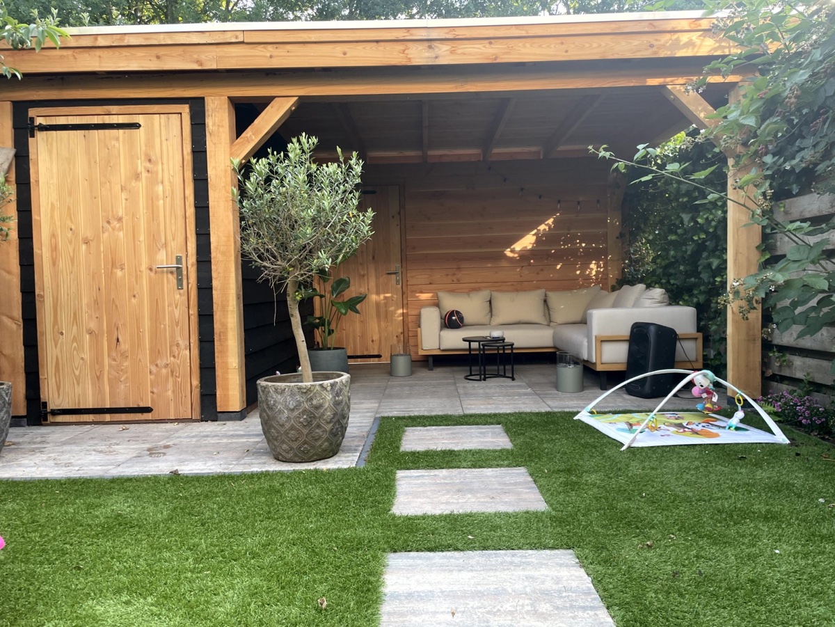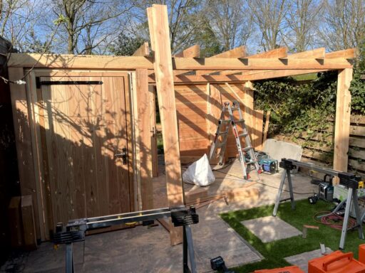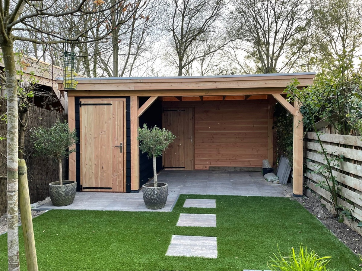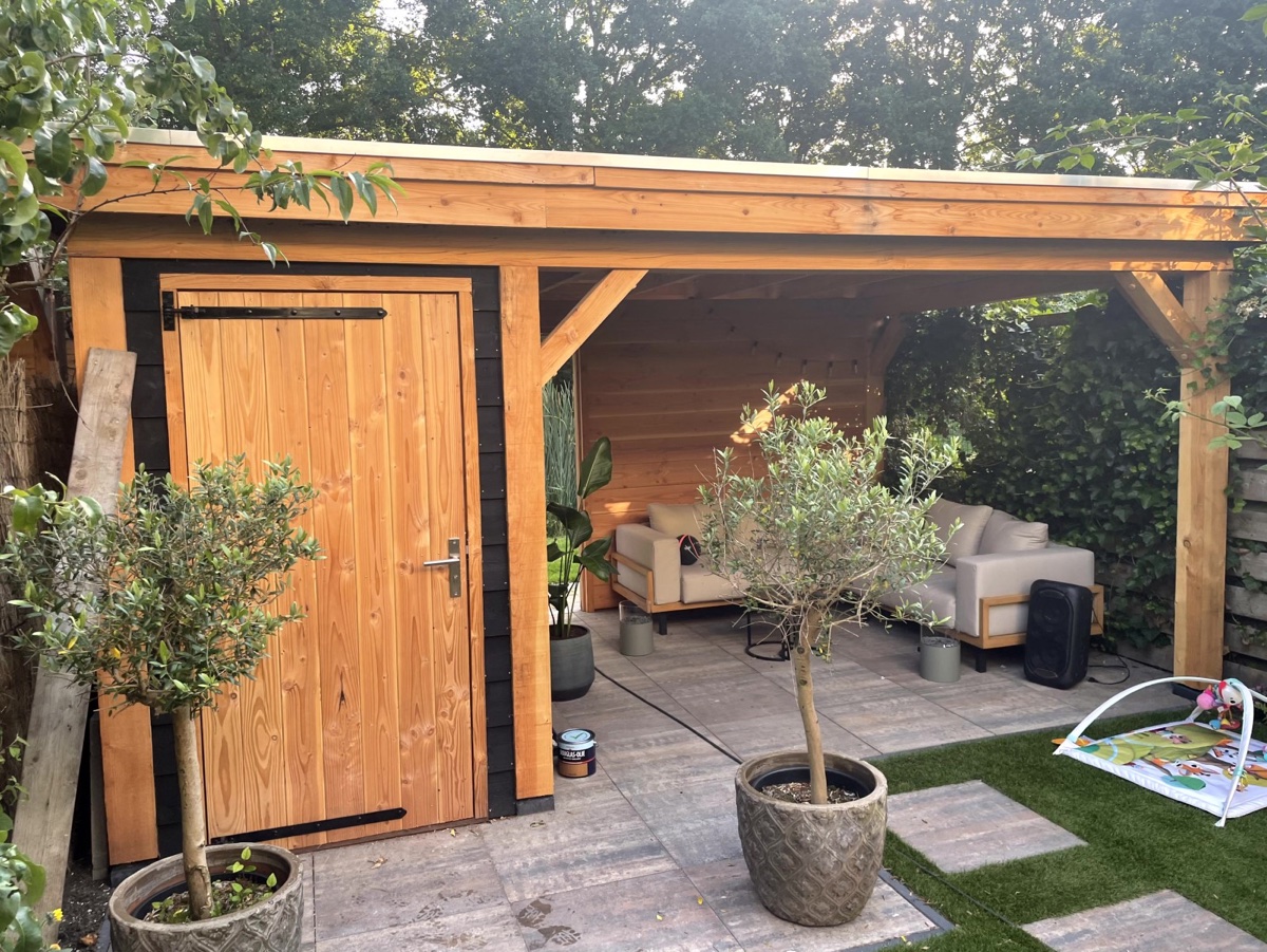 Agelopen week een overkapping met berging geplaatst in Nieuwkoop deze heeft een totale afmeting van 5,3 x 3,2 meter en de berging en is gemaakt van douglas hout , op het dak ligt EPDM.