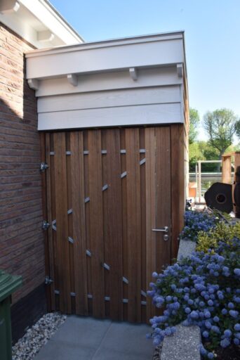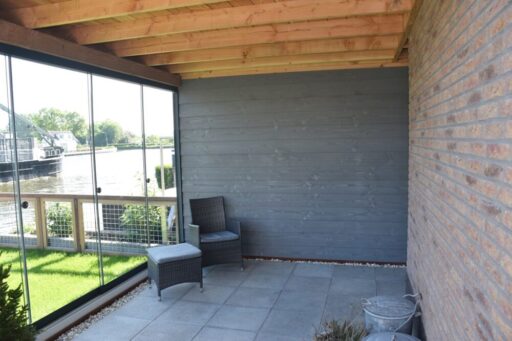 De wanden van de overkapping zijn bekleed met douglas hout zweeds rabbat.