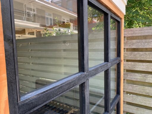 Een van de zij wanden en een stukje van de voorkant is voorzien van glazen ruitjes.