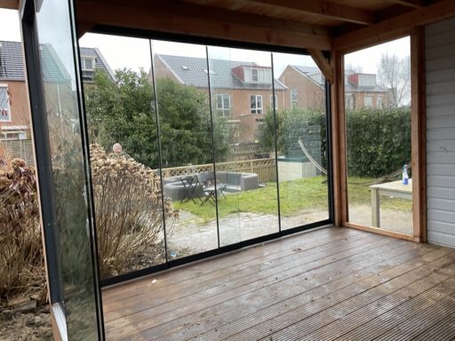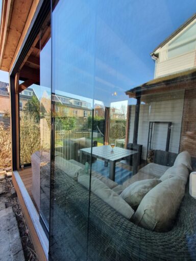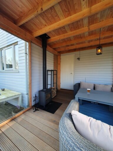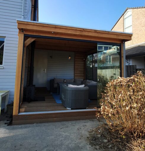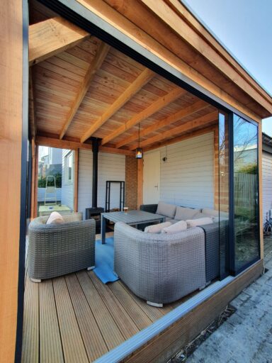 de overkapping is gemaakt Douglas hout ondanks dat de overkapping tegen het huis is gemaakt staat deze er toch los van , aangezien de overkapping met vlonder niet onderuit is en het huis wel , naast de twee glazen schuifwanden is in de ene zijkant ook nog een extra raam geplaatst voor nog meer licht inval. Op het dak ligt EPDM.