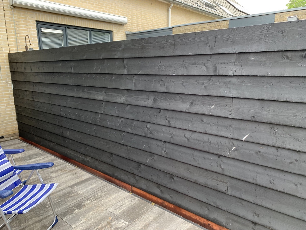 De robuuste staanders zijn van douglas hout 150 x 150 mm De wanden zijn bekleed met zwarte rabat delen.