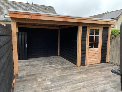Afgelopen week een overkapping geplaatst in Montfoort ,deze rust op een hardhouten fundering met daarop robuuste Douglas houten palen. de wanden zij geïsoleerd voor wat extra geluid isolatie en zijn daarna bekleed met zwarte rabat delen.