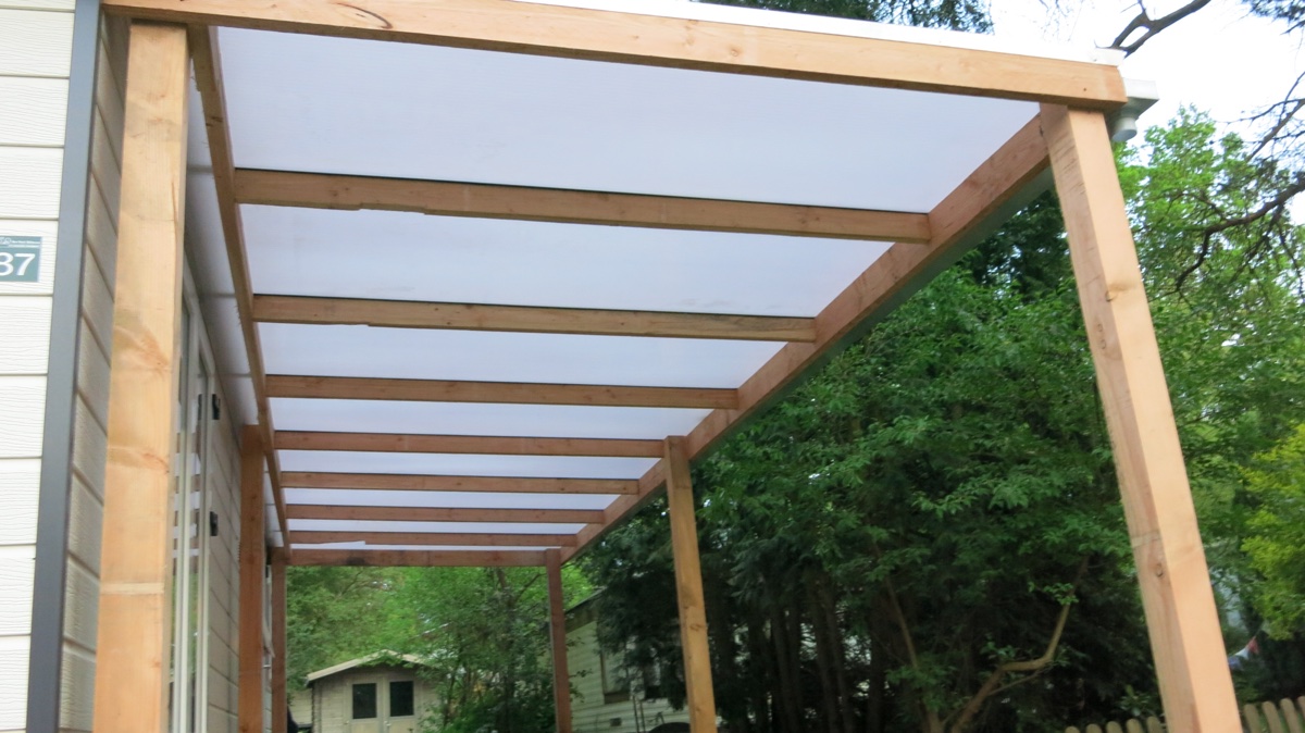 Op maat gemaakte overkapping voor aan de voorkant van de caravan de overkapping bestaat uit douglash houten palen en balken en voor het dak hebben we gekozen voor een polycarbonaat plaat.