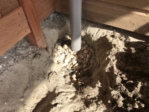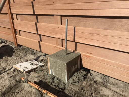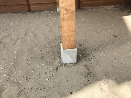 De overkapping is gemaakt van robuuste douglas palen, balken en planken. De staanders van de overkapping rust op een betonnen poer met daaronder een hardhouten paal ,dit vormt de fundering van de overkapping.