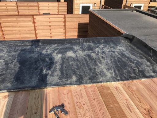 het dak is geplakt met EPDM en hemel water afvoer door middel van een grind put.