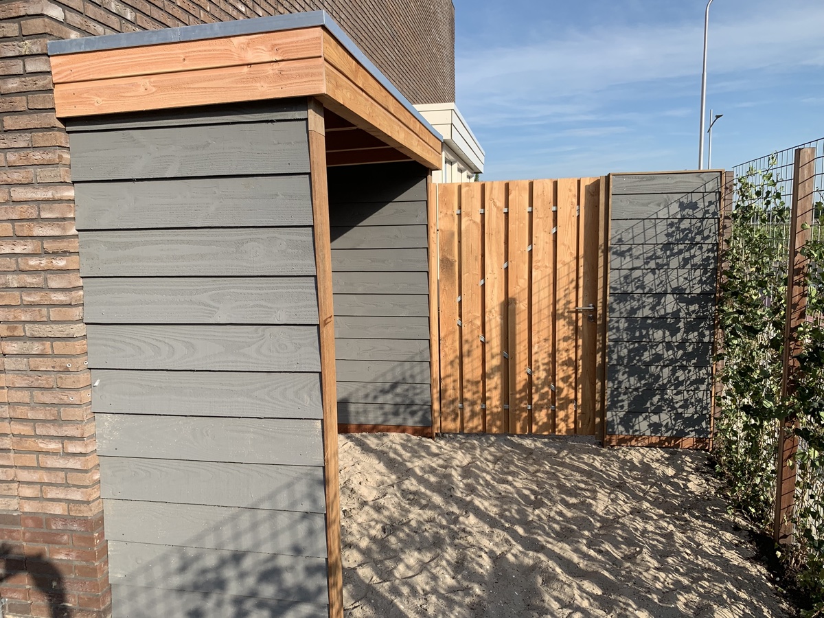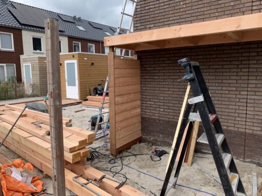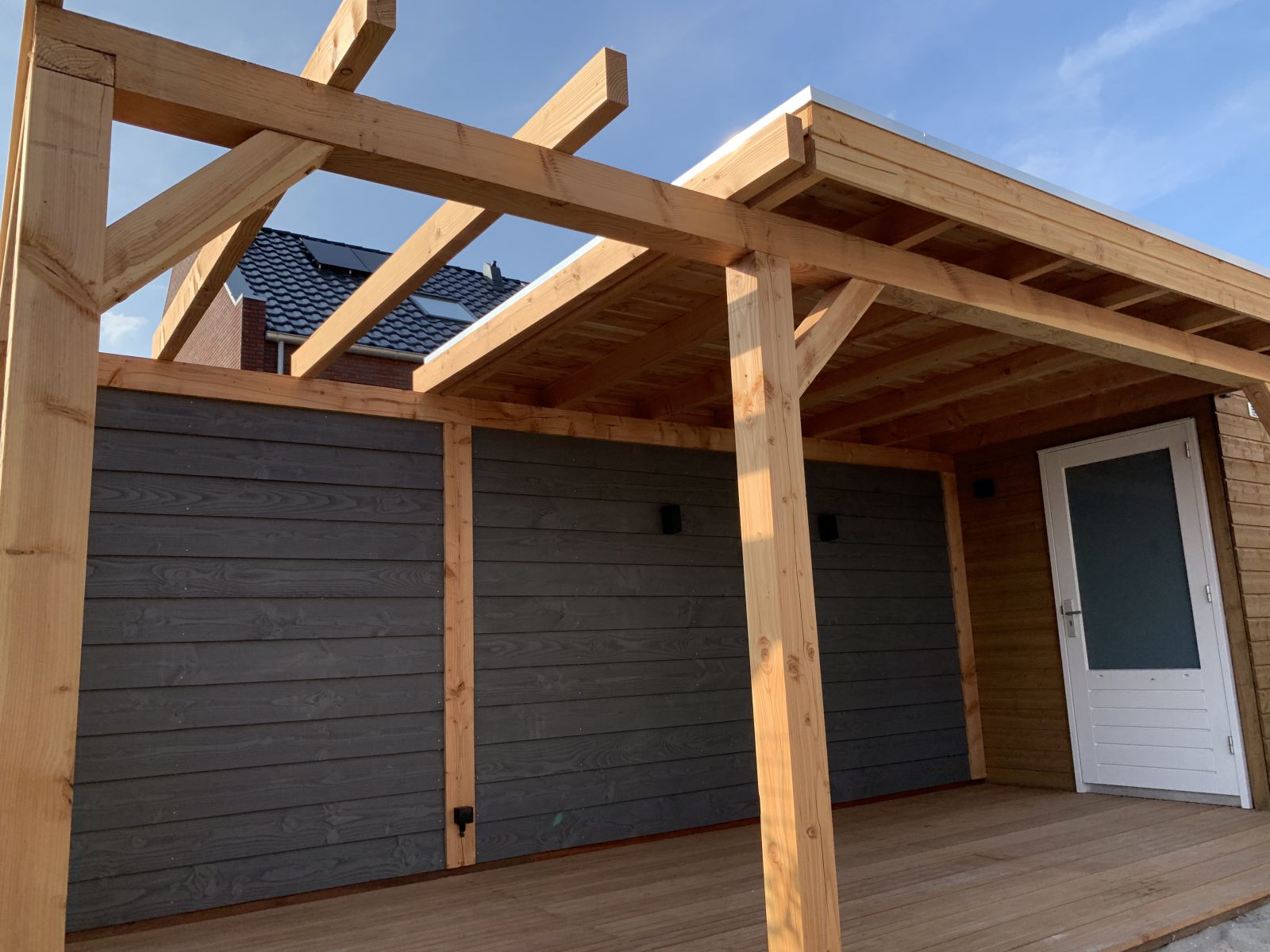 Afgelopen week in de nieuwbouw wijk Koningskwartier in Zeven huizen 2 douglas houten overkappingen geplaatst. Waarvan de kleine variant is bevestigd aan het huis, en en in de wand van de overkapping is een poortdeur geplaatst.