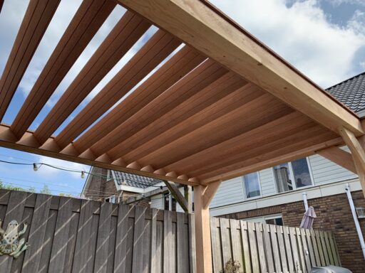 En om wat schaduw te creëren is een gedeelte van de pergola voorzien van hardhouten lamellen.
