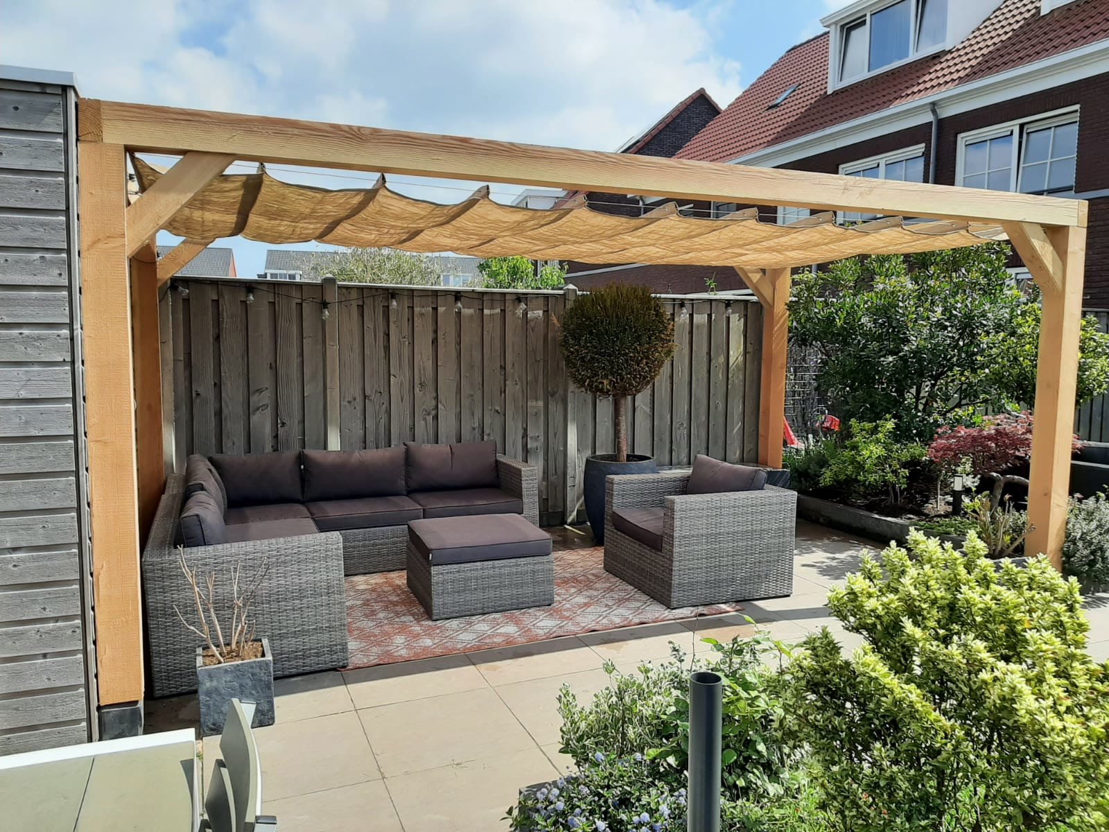 Afgelopen week een pergola met een harmonica schaduw doek geplaatst in Zevenhuizen , deze is gemaakt van Douglas houten palen 150 x 150 mm, de staanders van de pergola staan op verstelbare betonnen poeren. tussen de horizontale palen hebben wij een een harmonica schaduw doek gehangen deze is van het merk nesling.