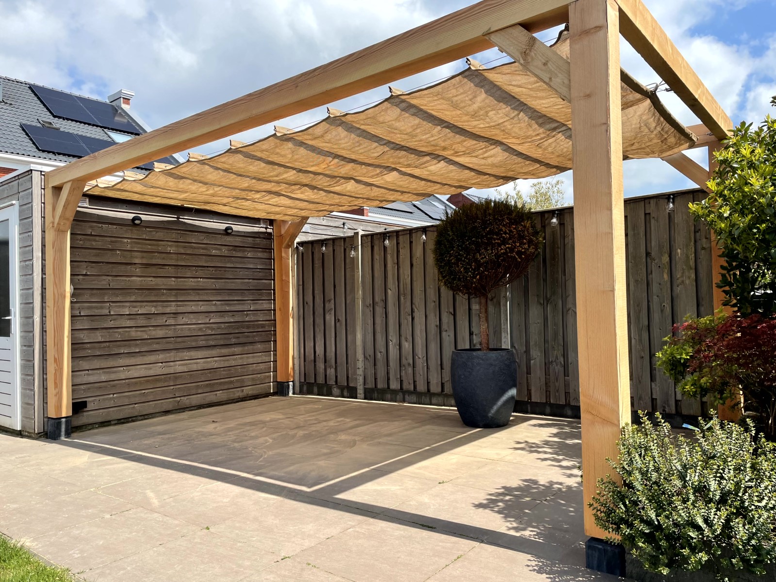 Afgelopen week een pergola met een harmonica schaduw doek geplaatst in Zevenhuizen , deze is gemaakt van Douglas houten palen 150 x 150 mm, de staanders van de pergola staan op verstelbare betonnen poeren. tussen de horizontale palen hebben wij een een harmonica schaduw doek gehangen deze is van het merk nesling.