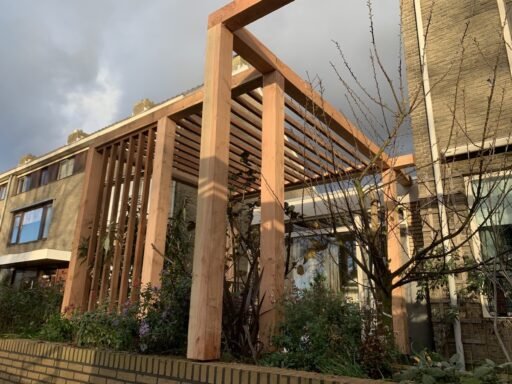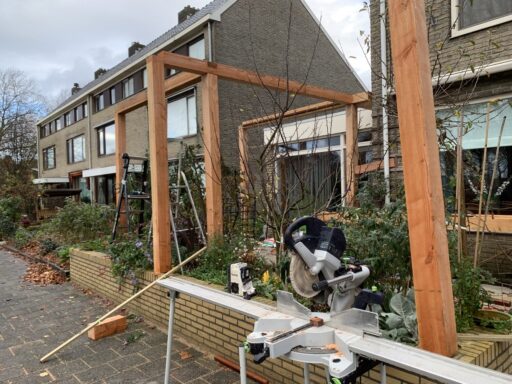 Afgelopen week een pergola geplaatst in Rijswijk deze is gemaakt van douglash houten palen en hardhouten liggers. Een gedeelte van de staanders staan op betonnen poeren.