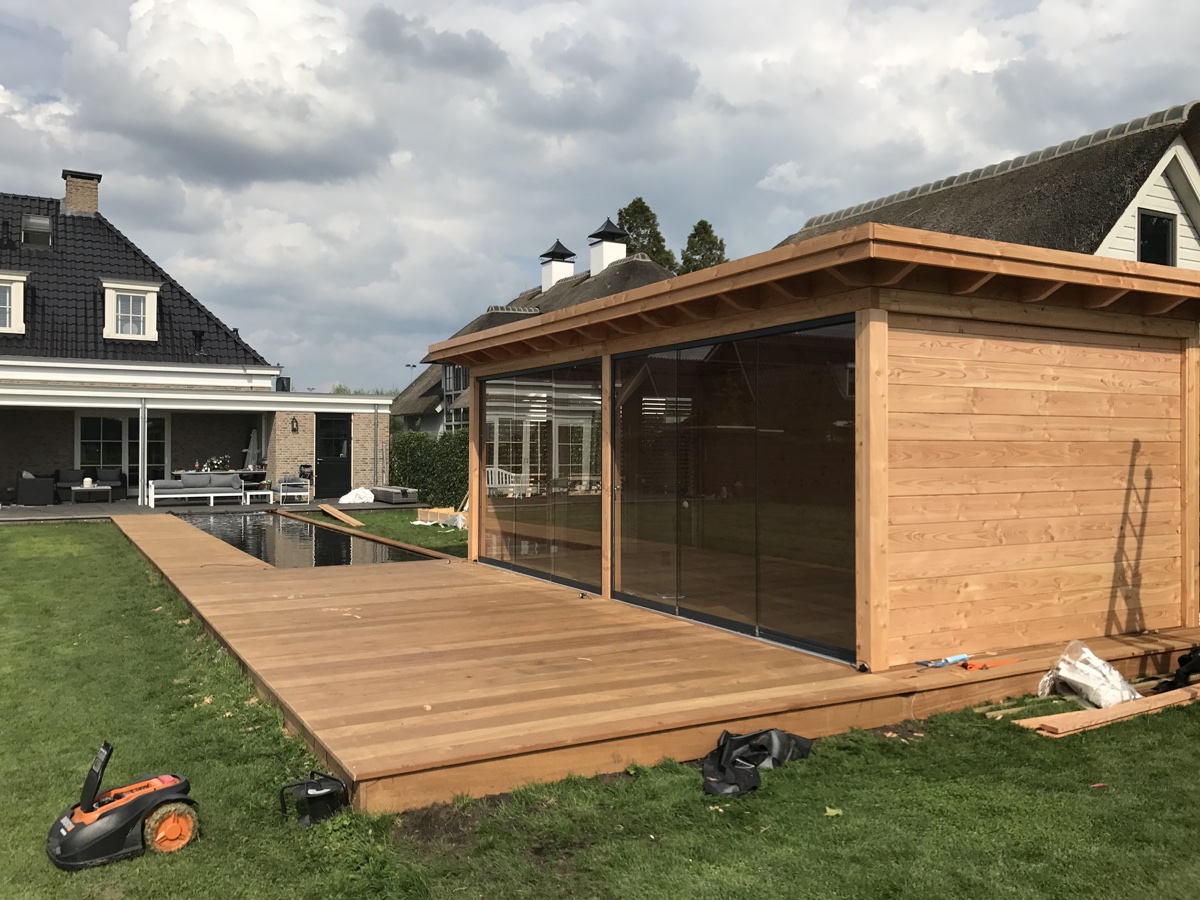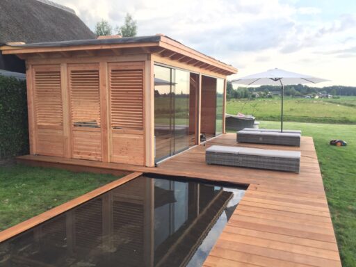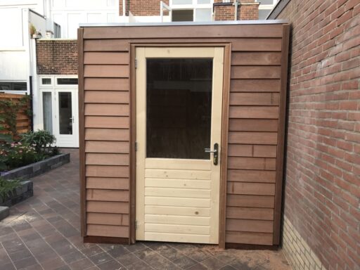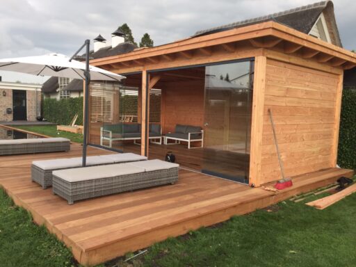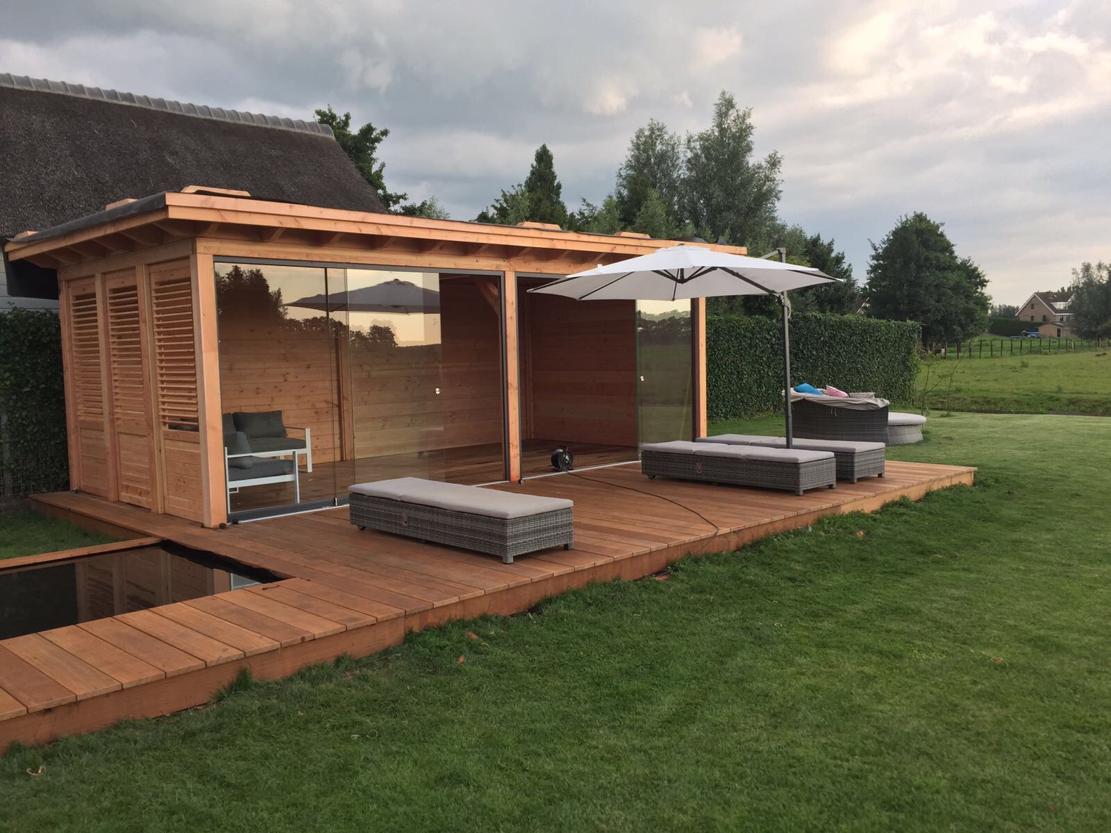 Een buitenverblijf kan goed gecombineerd worden met een berging of schuur. Met een kunststof of houten vlonder, maakt u het geheel af.