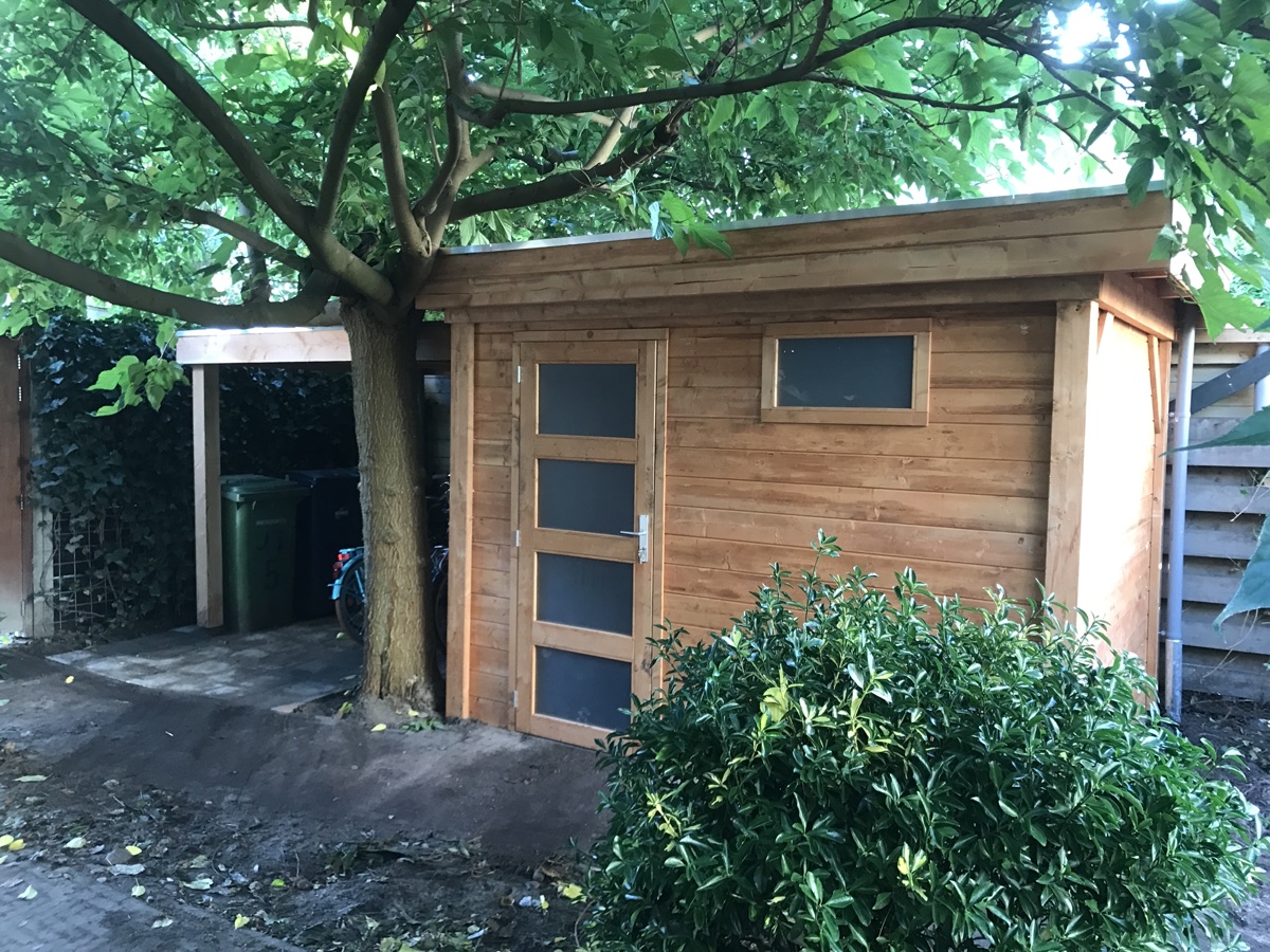 Plaatsen van bouwpakket schuur met afdak