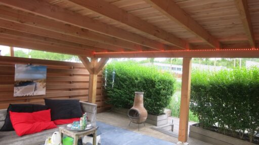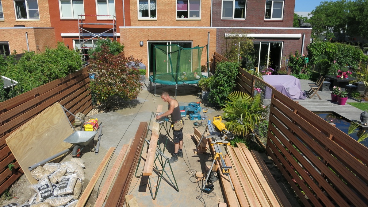 Naast het buitenverblijf hebben wij ook de hardhouten schutting geplaatst. Deze bestond uit hardhouten OSB-palen (65 x 65 x 3050 mm.) gecombineerd met hardhouten Keruing schuttingplanken (16 x 145 mm.). Het geheel is bevestigd met RVS schroeven. Om het geheel wat te breken en wat meer variatie aan te brengen hebben wij nog een hardhouten gaaspaneel geplaatst.