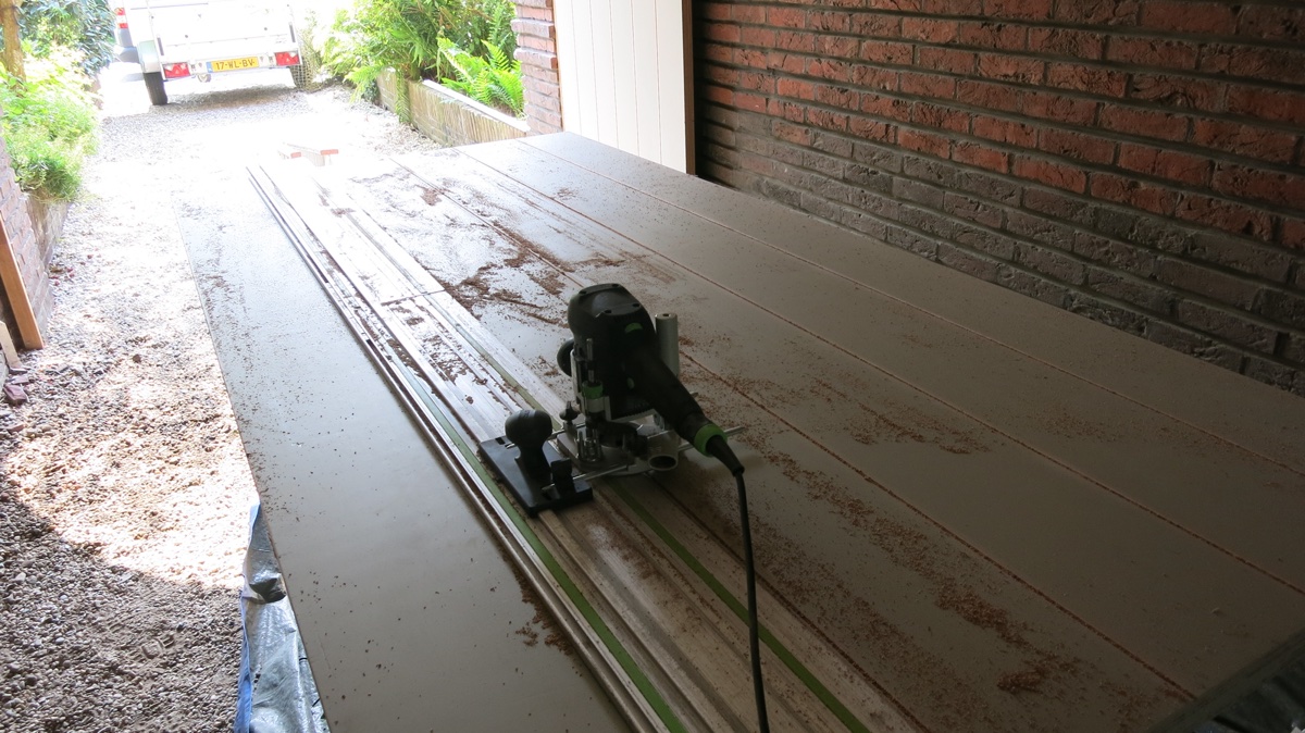 Voor de deuren hebben we gekozen voor twee massieve watervast multiplex platen van 40 mm dik. om in de dezelfde style te blijven als de jaren 30 woning hebben wij in de gladde platen een aantal V groeven gefreesd zodat het net lijkt of deuren bestaat uit samen gestelde planken ,of te wel een nostalgische look te geven .