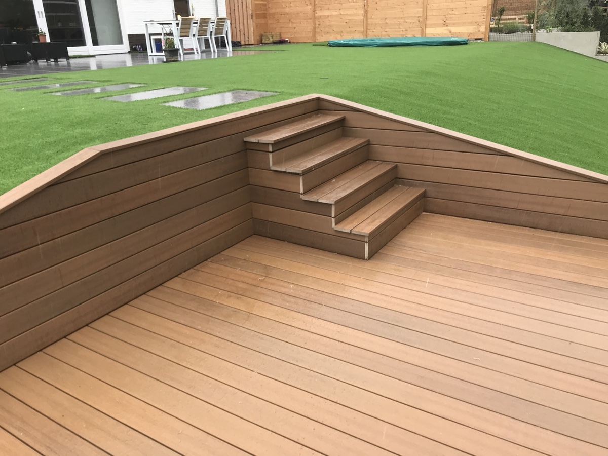 het composiet van het merk fiberon warm siena is geplaatst op een hardhouten regelwerk en door middel van clips onzichtbaar geschroefd.
