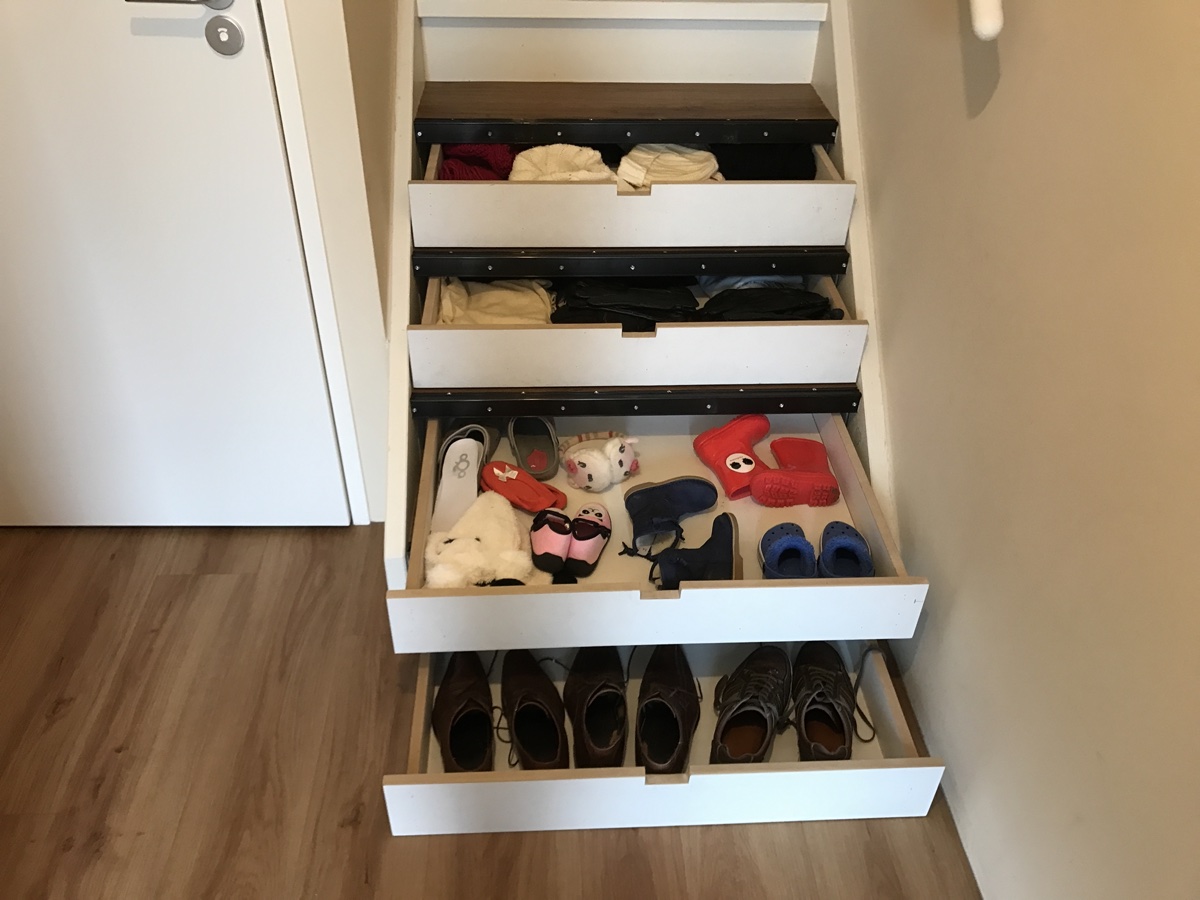 wat normaal het stootboard van de trap is nu het front van de lade is .De kast en de lades zijn gemaakt van MDF platen met lak folie.