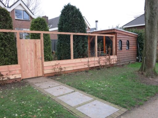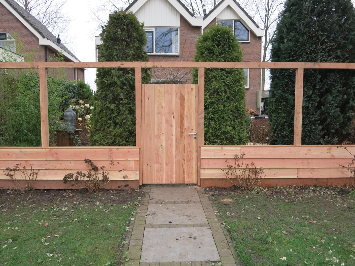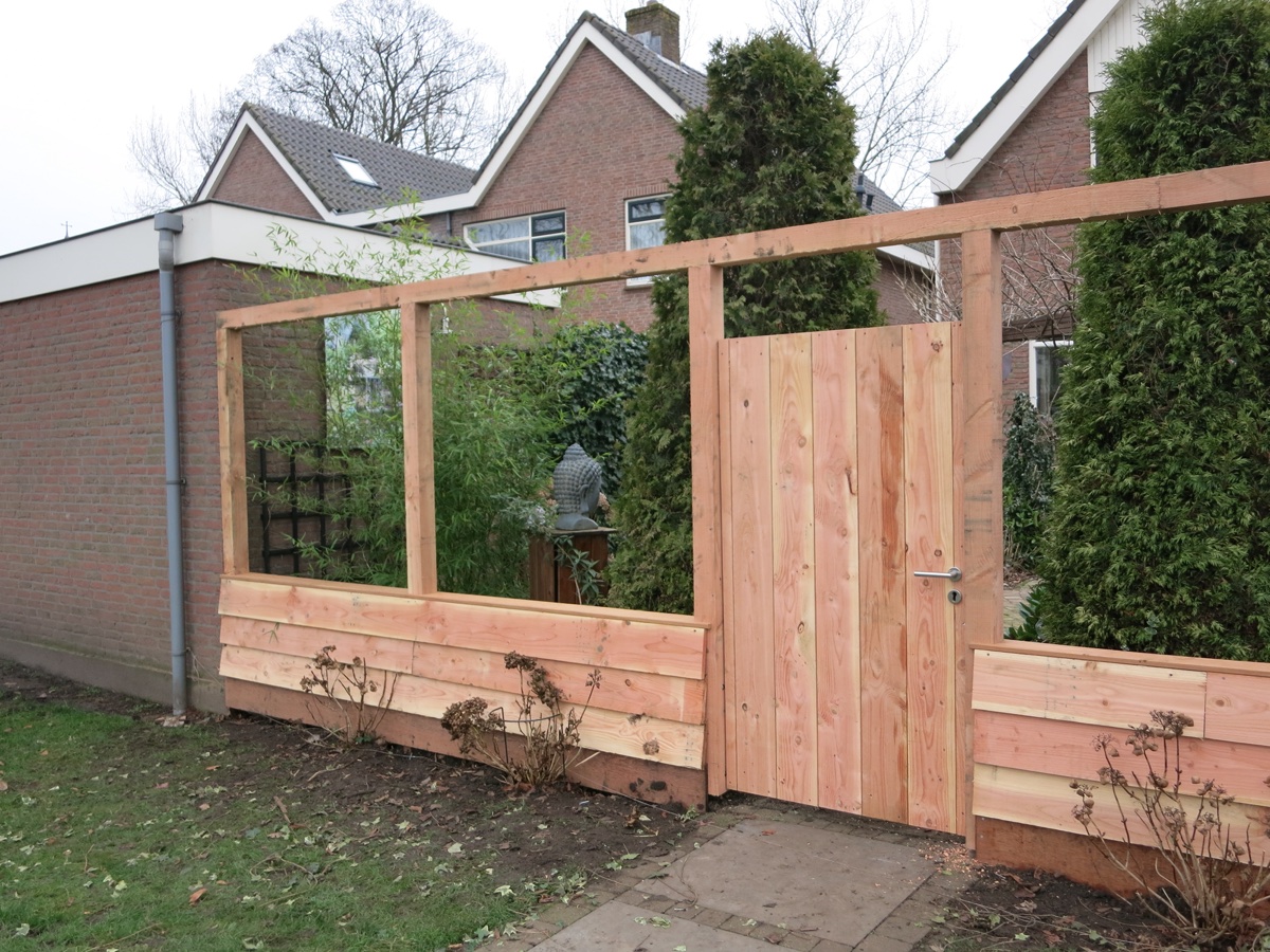 MP Timmer- en Onderhoudsbedrijf plaatste deze Douglas houten schutting met robuuste palen van 100 x 100 mm. en een hardhouten onderplank. De deur van de schutting is gemaakt van Douglas hout op een gegalvaniseerd frame en voorzien van een cilinderslot.