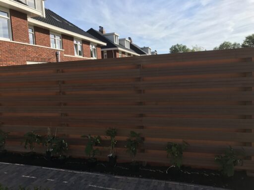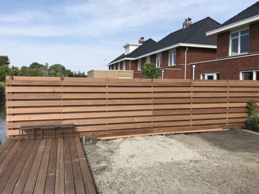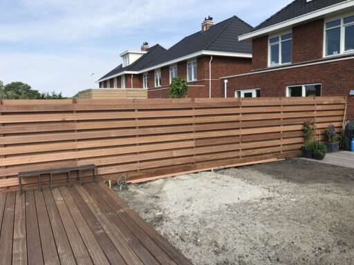 De schutting bestond uit geschaafde hardhouten palen 65 x65 x3050 mm en met daarop hardhouten schutting delen RVS bevestigd.