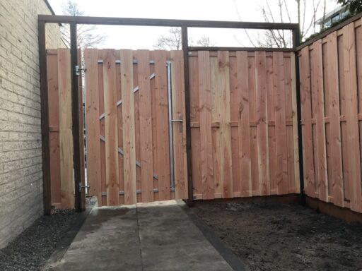 De douglash houten schutting delen zijn bevestigd op een gegalvaniseerd stalen frame en is voorzien van een RVS cilinder slot.