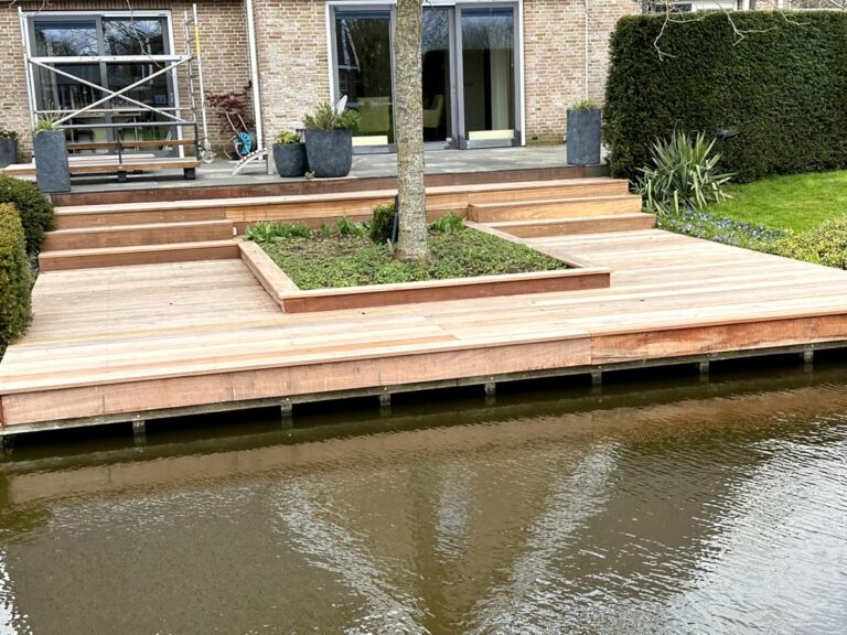 Hardhouten vlonder Afgelopen week hebben wij een hardhouten vlonder geplaatst in Stolwijk deze bestaat uit een regelwerk van hardhouten balken…