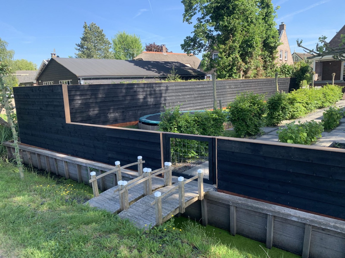 Afgelopen week een schutting geplaatst in Bodegraven deze betond uit een hardhouten borderplank en palen met daarop zwart gespoten douglas houten rabat delen bevestigd.