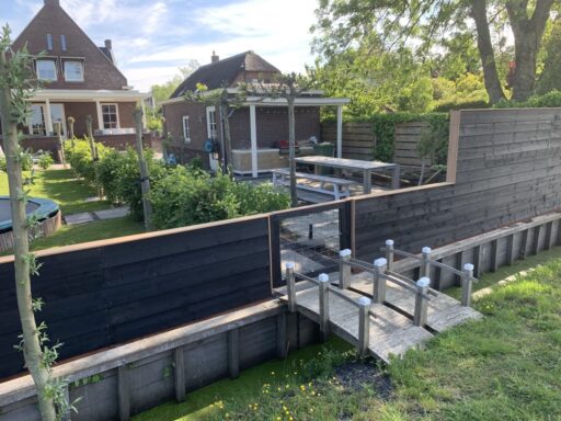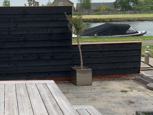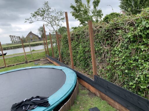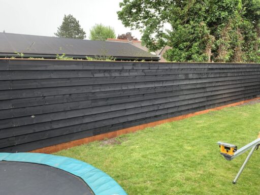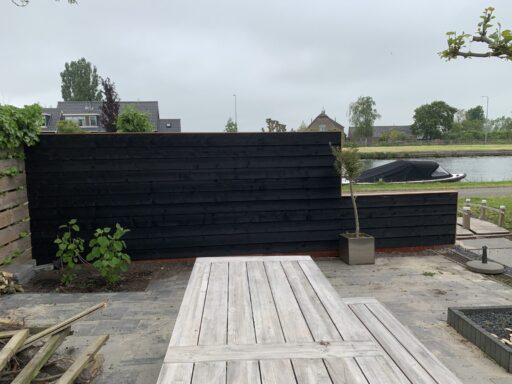 Afgelopen week een schutting geplaatst in Bodegraven deze betond uit een hardhouten borderplank en palen met daarop zwart gespoten douglas houten rabat delen bevestigd.