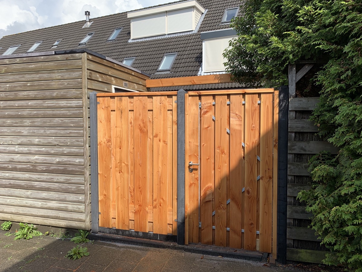 Een schutting met poortdeur , vlonder en een pergola geplaatst in Alphen aan de Rijn